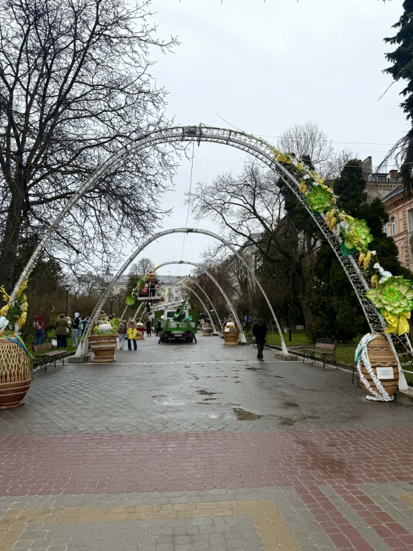 Святковий простір тут буде прикрашено декоративними кошиками, барвистими писанками та світлодіодними арками, оздобленими квітами й вербовими гілками.