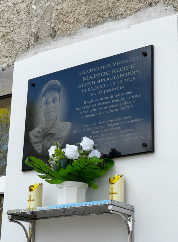Довідка. Арсен Козуб - український військовий, матрос, водій-лінійний наглядач відділення зв’язку взводу зв’язку 2-го батальйону морської піхоти військової частини А4765. Народився 14 лютого 2000 року в місті Тернополі. Навчався в Тернопільській загальноосвітній школі І-ІІІ ступенів № 10. Займався кікбоксингом. Був єдиним сином у батьків. Мобілізований до лав Збройних Сил України 10 липня 2025 року. Загинув 10 жовтня 2025 року в населеному пункті Мирноград Покровського району Донецької області, виконуючи бойове завдання. Похований на Пантеоні Героїв Тернополя, що на Микулинецькому кладовищі. Залишилися мама Наталя, бабуся Ярослава, рідні, друзі. Посмертно удостоєний звання «Почесний громадянин міста Тернополя».